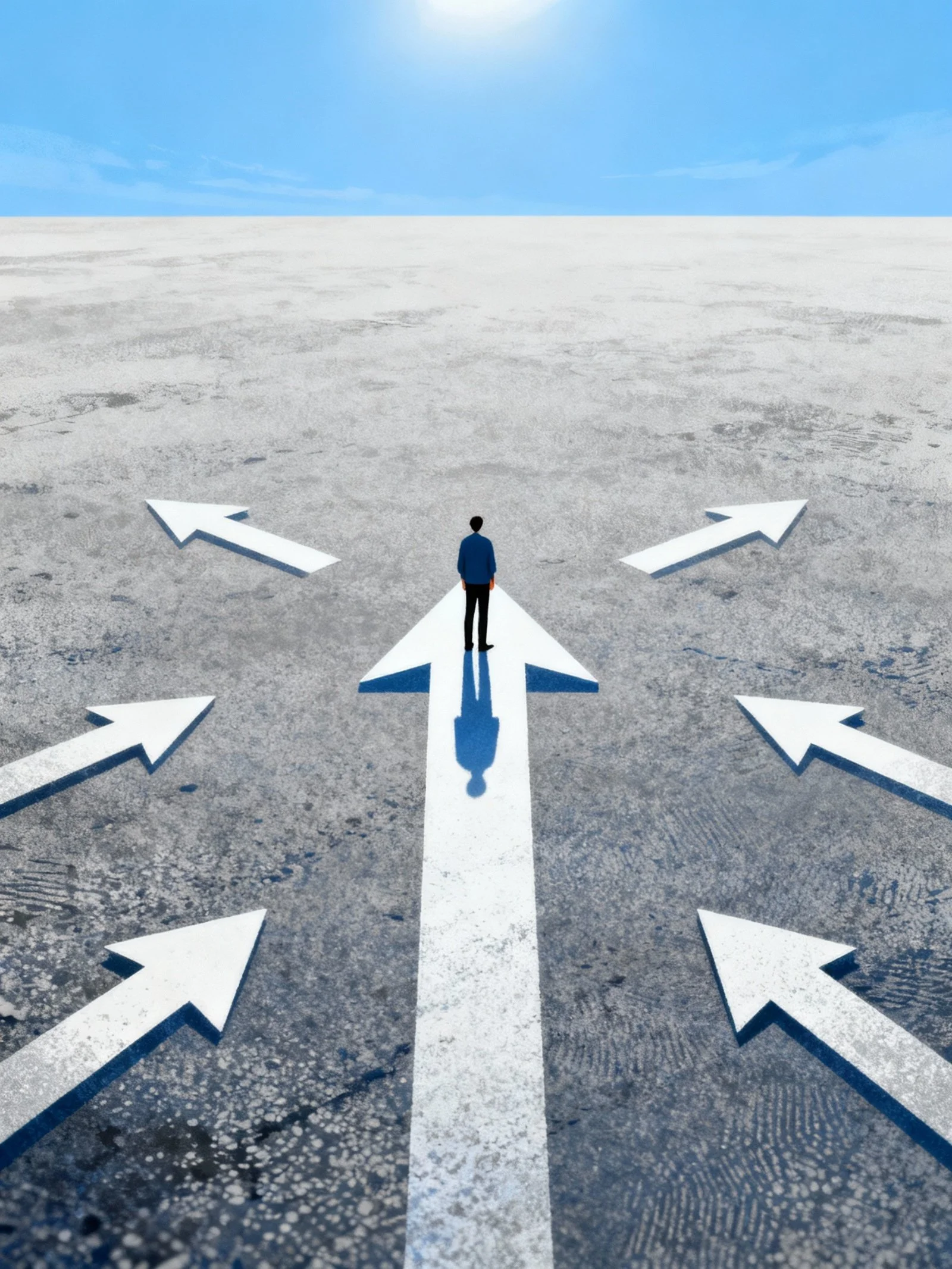 A person standing at the center of multiple arrows pointing in different directions, symbolizing decision-making, clarity, and choosing the right path during consultation or personal transitions.
